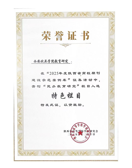 近日,陜西省高等學校學報研究會九屆六次理事會議暨2025年秋季學術年會在楊凌召開,正式公布 “2025 年度陜西省高校期刊建設示范案例庫入庫名單”。《西安歐亞學院教育研究》成功入選“優秀社科期刊”案例,其核心欄目“民辦教育研究”同步獲評“社科期刊特色欄目”。