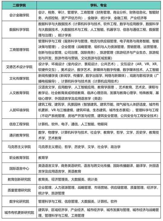 目前共有20000余名在校生,學校下設會計金融學院、數據科學學院、工商管理學院、文化傳媒學院、人文教育學院、艾德藝術設計學院、信息工程學院、人居環境學院、職業教育學院、通識教育學院、馬克思主義學院、國際語言中心等12個教學機構。