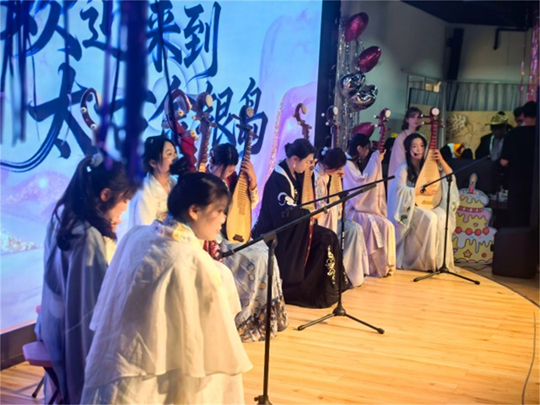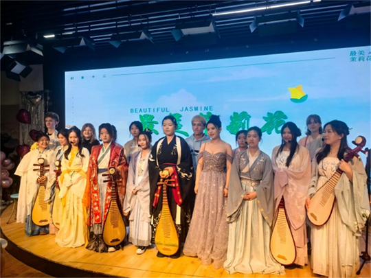 在酒會間歇,來自國際交流學院的留學生們一起登臺,指尖輕撥琵琶弦,《茉莉花》的悠揚旋律隨即在會場響起。這段不到三分鐘的演奏,成為酒會現場最溫暖的“文化共鳴點”也為后續的跨文化交流環節埋下伏筆成為跨文化協作的生動體現。