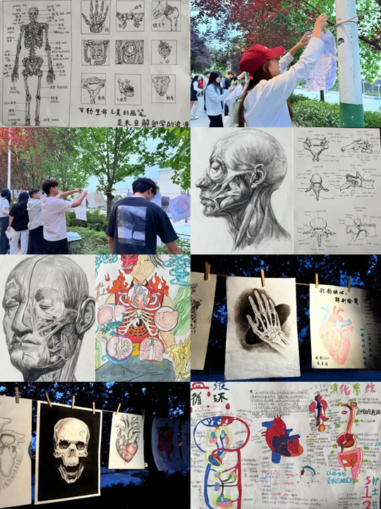 同學們畫筆如刀,繪出層層解剖真理;顏料為基,筑起巍峨醫技大廈,將嚴謹的科學觀念和創作的藝術靈感融為一體,將抽象化為具體,不斷碰撞出醫學與藝術,理性與美感的火花。經由木夾錯落垂懸于縱橫交錯的麻繩裝置之上,在校園里構筑起流動的醫學畫卷,讓嚴謹的醫學知識以輕盈姿態躍入校園公共空間。