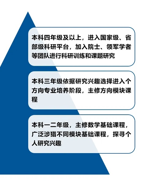 在“知識(shí)傳授、能力培養(yǎng)、素質(zhì)提升、人格塑造”人才培養(yǎng)體系基礎(chǔ)上,傳承“起點(diǎn)高、要求嚴(yán)、基礎(chǔ)厚、重實(shí)踐”的教學(xué)傳統(tǒng),融合工科優(yōu)勢(shì),進(jìn)一步發(fā)揮“數(shù)學(xué)基礎(chǔ)強(qiáng)根基,應(yīng)用數(shù)學(xué)提能力,數(shù)學(xué)應(yīng)用促創(chuàng)新”的專業(yè)人才培養(yǎng)特色,實(shí)施“三制五化”育人模式,即雙院制、導(dǎo)師制、學(xué)分制、小班化、個(gè)性化、國(guó)際化、科教協(xié)同化、培養(yǎng)一體化。