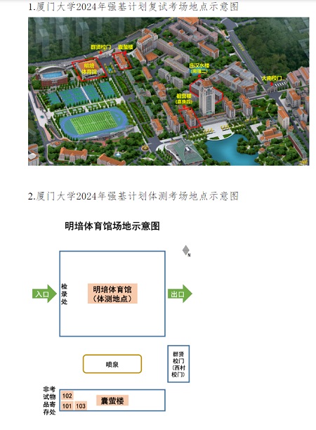 取得復試資格(含第一類和第二類)的考生須于2024年6月16至17日在廈門大學思明校區參加復試(包括筆試、面試、體育測試,第二類考生參加面試、體育測試)。具體通知如下: