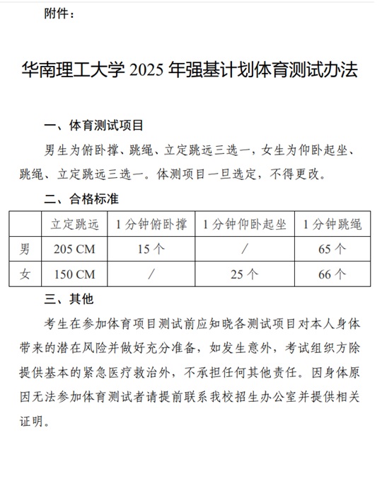 附件:華南理工大學2025年強基計劃體育測試辦法.pdf(點擊查看)