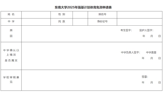 注:申請免測的考生,須于6月18日下午17:00前將申請表掃描件、三級甲等醫院證明掃描件發送至我校招生辦郵箱(zhaoban@seu.edu.cn),經我校審核通過后方可體育免測。考生須承諾提交的所有材料客觀、真實,如有虛假內容,將取消其強基計劃錄取資格。