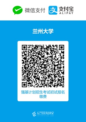 已報名蘭州大學2025年強基計劃招生考試并通過審核的第一類考生,請于2025年5月23日00:00-6月10日16:00登錄蘭州大學強基計劃報名平臺(https://bm.chsi.com.cn/jcxkzs/sch/10730)進行強基計劃招生考試初試確認并通過微信或支付寶掃描下方二維碼進行繳費。逾期未確認考試及繳費的考生,視為放棄后續(xù)選拔。繳費完成的考生,如需電子收據(jù),請于2025年7月10日之前通過電子郵箱(zsks@lzu.edu.cn)聯(lián)系蘭州大學招生辦公室。