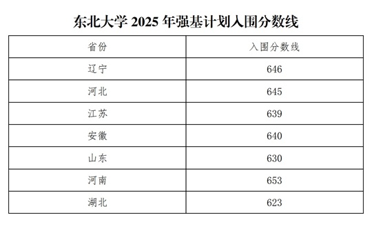 我校根據各省招辦提供的考生高考成績(不含任何政策加分,下同),按照《東北大學2025年強基計劃招生簡章》要求確定入圍學校考核測試資格,入圍結果請登錄東北大學強基計劃報名平臺(網址:https://bm.chsi.com.cn/jcxkzs/sch/10145)查詢,強基計劃分省入圍分數線詳見附件。