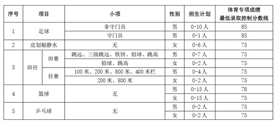 1.文化成績、體育專項成績均須達到我校劃定的最低錄取控制分數線:文化成績不低于150分,對具備運動健將技術等級的考生,文化成績不低于130分;體育專項成績:足球項目不低于85分,男子籃球項目不低于78分,其他項目不低于75分。