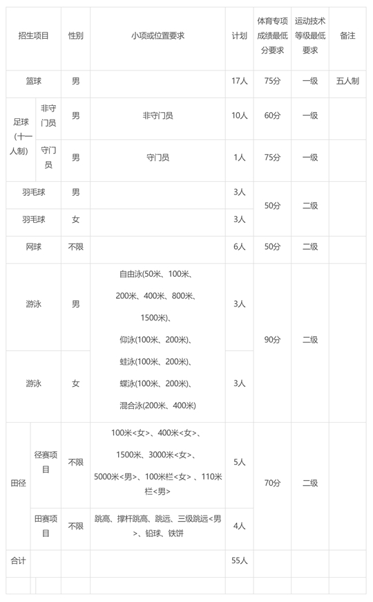 (2)足球(男子,十一人制)項目招收一級及以上運動等級運動員,非守門員項目體育專項成績不低于60分,守門員項目體育專項成績不低于75分。