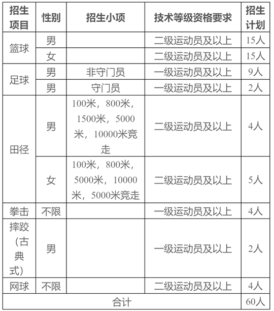 注:以上各招生項目最終錄取人數將視生源情況確定,學校可對招生計劃進行項目間調整。籃球項目考生使用五人或三人籃球運動員技術等級證書均可報名,按照籃球項目考試方法與評分標準參加籃球專項測試。