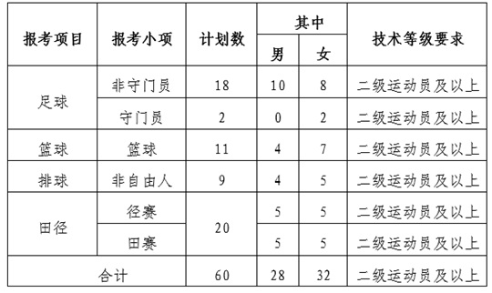 2.考生必須具備所列招生項目之技術等級資格要求。考生運動員技術等級以“國家體育總局運動員技術等級系統”公示的數據信息為準。等級證書審批日期:2015年1月1日——2025年3月10日。
