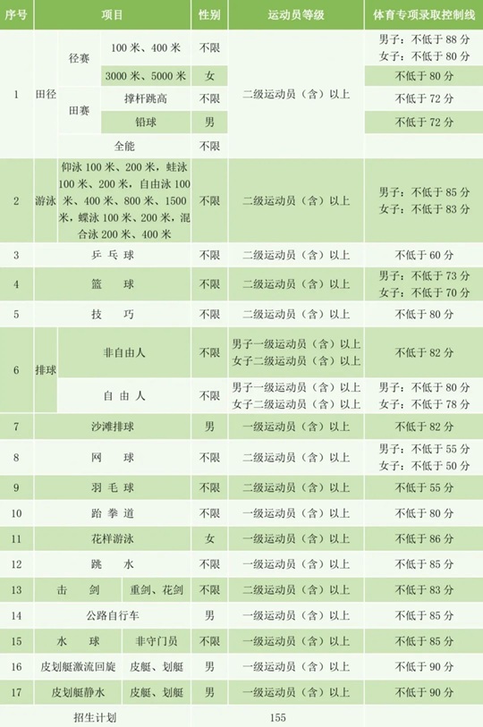 1.我校將根據實際情況,在文化成績錄取控制分數線不低于180分、體育專項成績錄取控制分數線不低于40分的基礎上,綜合確定我校各招生項目專業成績錄取控制線。