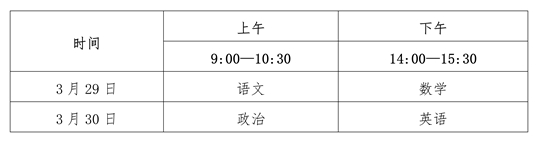考生須參加高考報名所在地省級招生考試機構組織的文化考試。考試科目:語文、數學、政治、英語四科;考生分值:每科滿分為150分,總分600分。