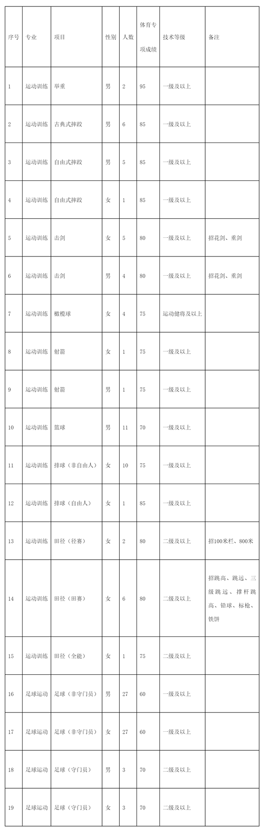 2.運動訓練專業招生計劃為60人,足球運動專業招生計劃為60人,最終錄取人數視生源情況及上級主管部門批復決定。