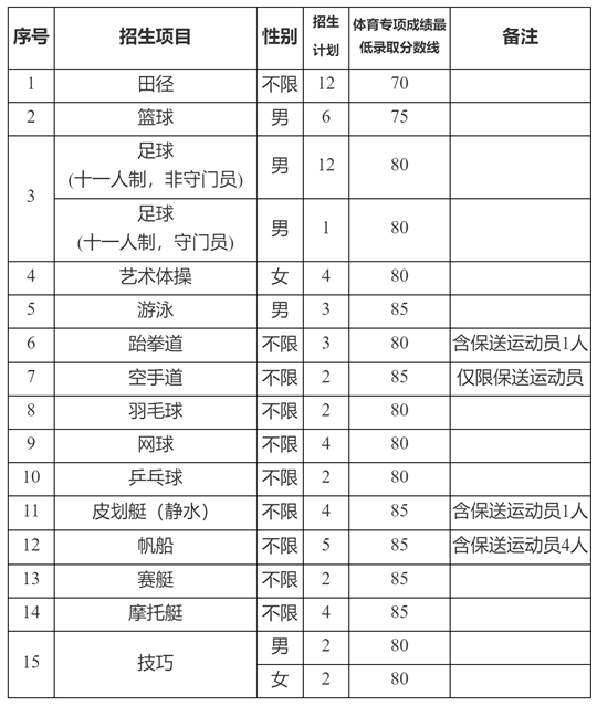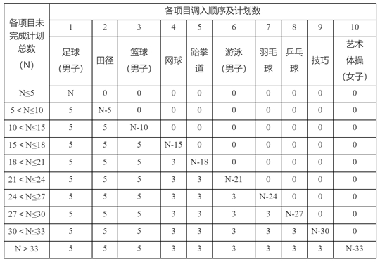 (四)我校各專業在項目二志愿錄取未完成的情況下,將進行計劃調整,剩余的招生計劃將優先調整至我校重點發展的足球(男子)、田徑、籃球(男子)、網球、跆拳道、游泳(男子)、羽毛球、乒乓球、技巧、藝術體操(女子)項目。其中,足球按照綜合分由高到低排序,不再分小項;技巧項目按照綜合分由高到低排序,不再分性別。各項目調入順序及計劃數安排如下: