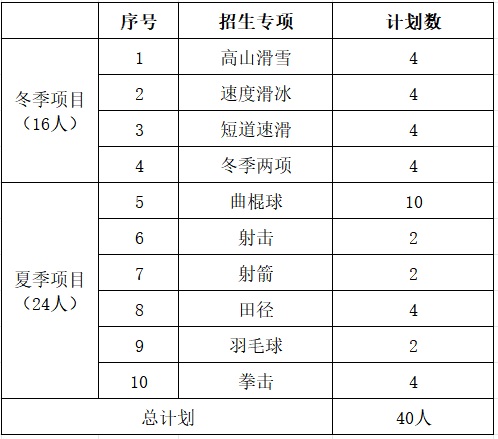 (二)招生項(xiàng)目:高山滑雪、速度滑冰、短道速滑、冬季兩項(xiàng)、曲棍球、射擊、射箭、田徑、羽毛球、拳擊。