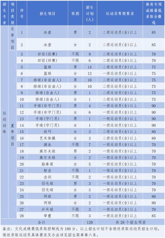 (2)體育專項成績最低錄取控制線:手球項目90分;冰壺、舉重項目85分;技巧、藝術體操、網球項目80分;籃球、排球項目75分;其他項目70分。具體見各項目招生計劃表。