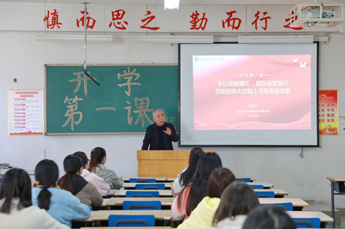 3月4日,山西工程科技職業(yè)大學(xué)黨委書(shū)記張主社在5號(hào)樓303教室,以“牢記領(lǐng)袖囑托,踔厲奮發(fā)前行——在新的偉大征程上書(shū)寫(xiě)青春華章”為題講授“開(kāi)學(xué)第一課”,外國(guó)語(yǔ)學(xué)院學(xué)生代表現(xiàn)場(chǎng)聆聽(tīng)授課。