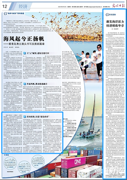 【編者按】6月20日出版的《光明日報》在“經濟”版以整版形式報道了青島市勇立潮頭,不斷探索創新,將美好藍圖變成現實的發展故事。其中,在“文化流淌”專題中刊發了山東省習近平新時代中國特色社會主義思想研究中心特約研究員、中國海洋大學文學與新聞傳播學院歷史文化系馬樹華教授的文章《激發海洋活力 續譜明珠華章》,闡述了青島這座充滿活力的海岸城市,與海洋緊密融合,推動事業快速發展的有關情況;在“海岸與城市”專題中報道了中國海洋大學青島海洋生物醫藥研究院打造“藍色藥庫”,在海洋藥物研發、成果轉化等方面的舉措和成果。內容如下: