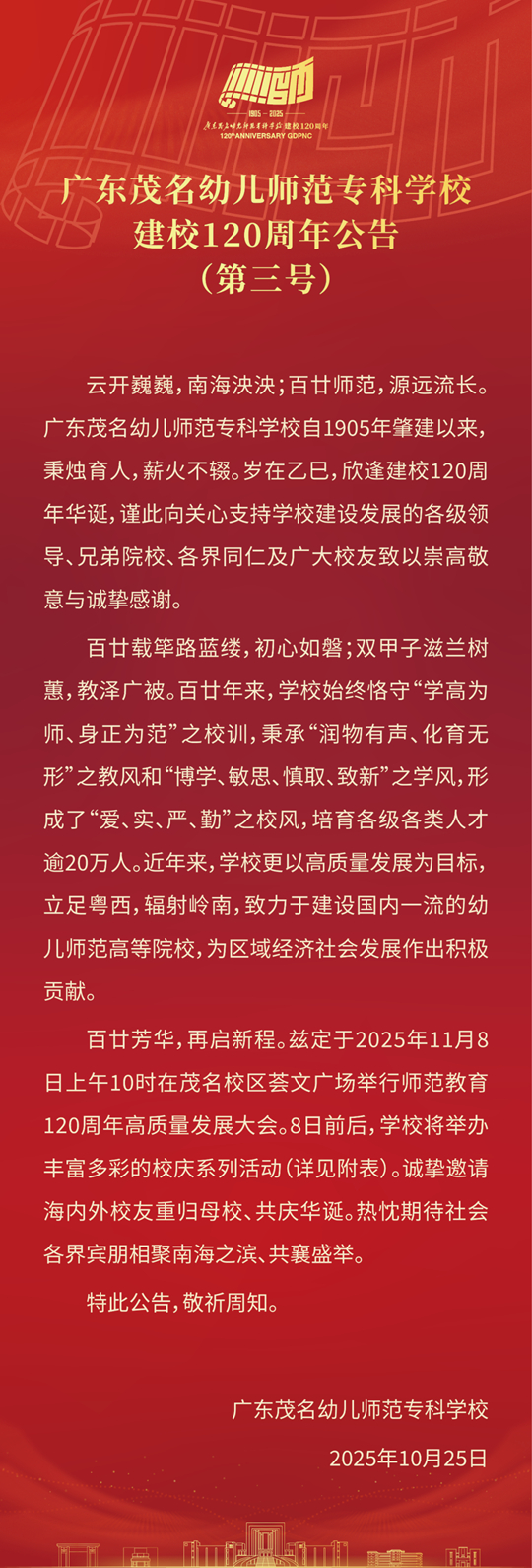 廣東茂名幼兒師范專科學校建校120周年公告(第三號)