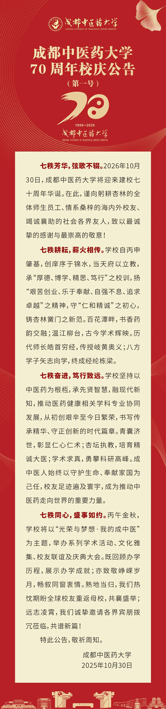 成都中醫(yī)藥大學(xué)70周年校慶公告(第一號(hào))