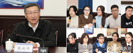 張峻峰認(rèn)真傾聽同學(xué)們的發(fā)言,對大家學(xué)習(xí)貫徹習(xí)近平總書記重要回信精神取得的學(xué)習(xí)與實踐成效給予充分肯定。他指出,一年來,學(xué)校深入貫徹落實習(xí)近平總書記給學(xué)校全體師生重要回信精神,深入實施“5135”發(fā)展戰(zhàn)略,深入實施藍(lán)夢宏才培育計劃,持續(xù)加強學(xué)生思想政治工作,不斷優(yōu)化人才培養(yǎng)模式,人才培養(yǎng)質(zhì)量持續(xù)提升,學(xué)校事業(yè)發(fā)展取得顯著成效。他結(jié)合學(xué)校有關(guān)工作開展情況和自己的經(jīng)歷,就同學(xué)們關(guān)心的問題進行深入探討和交流,并對同學(xué)們提出希望和建議。他希望同學(xué)們持續(xù)深入學(xué)習(xí)貫徹習(xí)近平總書記重要回信精神,紅色鑄魂,藍(lán)色筑夢,筑牢理想信念根基,將專業(yè)學(xué)習(xí)研究與國家戰(zhàn)略需求緊密結(jié)合,刻苦學(xué)習(xí),勇于創(chuàng)新,勤于實踐,注重知行合一,全面提升能力本領(lǐng),努力成長為胸懷藍(lán)色夢想、堪當(dāng)時代重任的優(yōu)秀海洋人才。