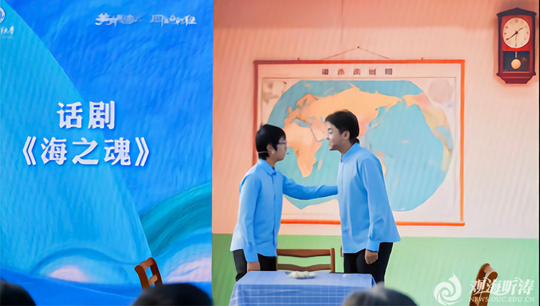 現(xiàn)場(chǎng)藝術(shù)演繹精彩紛呈,基礎(chǔ)教學(xué)中心藝術(shù)系學(xué)生、大學(xué)生藝術(shù)團(tuán)及海鷗劇社先后帶來(lái)合唱《問(wèn)道滄海》、聲韻合頌《藍(lán)色夢(mèng)想》、話劇《海之魂》、情境敘事合唱《藍(lán)色暢想》等節(jié)目。《問(wèn)道滄海》回溯學(xué)校百年辦學(xué)初心,《海之魂》再現(xiàn)革命烈士科研報(bào)國(guó)的英雄事跡,多樣藝術(shù)形式讓理論宣講更具感染力,實(shí)現(xiàn)了思想引領(lǐng)與審美體驗(yàn)的同頻共振。