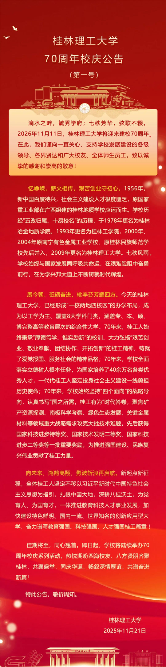 桂林理工大學(xué)70周年校慶公告(第一號(hào))