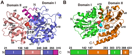 圖1. GpxB-G1P(A)和UgpB-G1P(B)的整體結(jié)構(gòu)