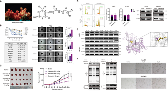 圖1.新型海鞘來源的萜類化合物通過靶向細(xì)胞周期調(diào)控因子UBE2C抑制腫瘤生長。(A) 真海鞘來源的天然抗腫瘤化合物Halorotetin B。(B) Halorotetin B體外抑制腫瘤細(xì)胞及腫瘤細(xì)胞球增殖。(C) Halorotetin B體內(nèi)抑制腫瘤生長。(D) Halorotetin B誘導(dǎo)腫瘤細(xì)胞周期阻滯。(E) 細(xì)胞周期調(diào)控蛋白UBE2C為Halorotetin B的直接作用靶點(diǎn)。(F) Halorotetin B通過靶向UBE2C誘導(dǎo)腫瘤細(xì)胞周期阻滯及腫瘤細(xì)胞衰老。