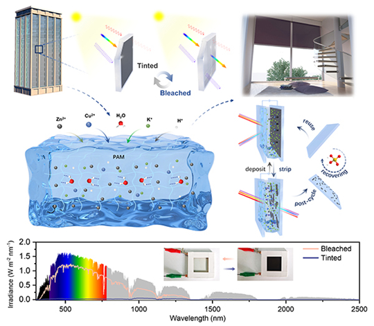 圖1. 準固態銅鋅雙金屬可逆電沉積智能窗工作機制與光熱調控示意圖