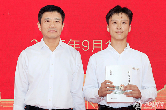 李明書記為新生代表佩戴;眨㈩C贈《中國海洋大學(xué)史·人物卷》