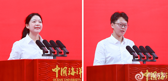 在校生代表王小可(左)、新生代表岳翔宇在典禮上發(fā)言