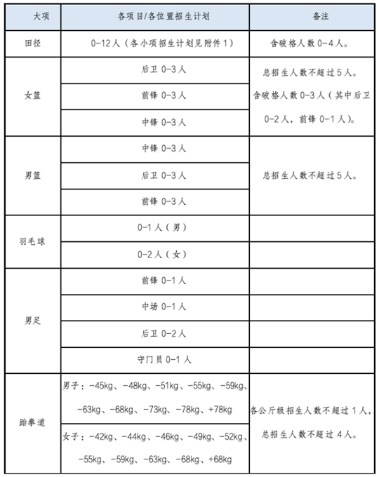 田徑、羽毛球、足球項目按照全國統(tǒng)考成績,分小項/性別/位置確定各招生項目合格名單。