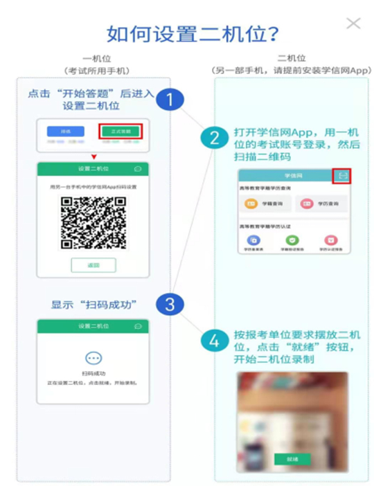 (3)“一機位”手機在點擊【排練】或【正式答題】后顯示設置“二機位”的二維碼。用另一部手機(“二機位”手機,請提前安裝學信網APP并使用相同的賬號登錄)進入APP首頁點擊右上角的掃一掃,掃碼成功并按要求擺放二機位手機,點擊【就緒】后二機位開始錄制。“一機位”手機點擊【開始錄制】后,“一機位”開始錄制。