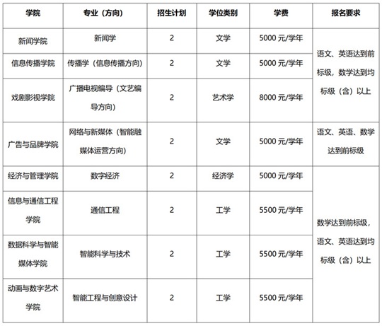 3. 本簡(jiǎn)章公布的招生專業(yè)是我校目前的本科專業(yè)設(shè)置,最終錄取專業(yè)以我校2026年本科招生計(jì)劃公布的專業(yè)名稱為準(zhǔn)。專業(yè)介紹詳見中國(guó)傳媒大學(xué)本科招生網(wǎng),網(wǎng)址: