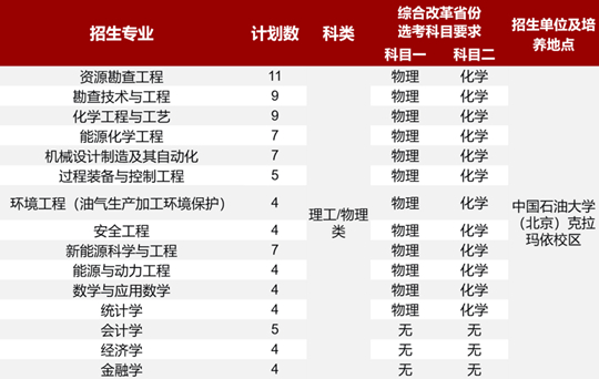 中國石油大學(xué)(北京)克拉瑪依校區(qū)(以下簡(jiǎn)稱“校區(qū)”)為招生單位和培養(yǎng)地點(diǎn),面向全國實(shí)施高校專項(xiàng)計(jì)劃的省份招生。