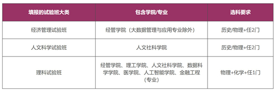 (二)人文科學試驗班:首選科目為歷史或物理,再選科目不限。大一結束時學生可在人文社科學院的所有專業內選定主修專業;