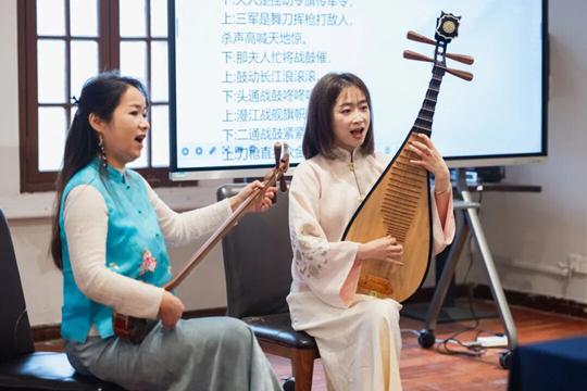 最后,在互動環(huán)節(jié),兩位嘉賓選取了一些評彈演奏中的常用語,如“你”“我”“他”等,逐字逐句地教大家發(fā)音,現(xiàn)場黨員積極跟隨學(xué)習(xí),氣氛十分熱烈。她們帶領(lǐng)現(xiàn)場黨員學(xué)唱評彈《鶯鶯拜月》的片段和蘊(yùn)含江南韻味的歌曲《聲聲慢》,吳儂軟語搭配清雅的三弦、琵琶伴奏,展現(xiàn)了傳統(tǒng)樂曲的韻味,活動在《聲聲慢》的動人合唱中結(jié)束。