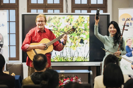 緊接著,馬曉輝教授與著名美國心理學教授、心理門診醫生Timothy A Kelly聯袂演繹美國鄉村音樂《Country Roads》,二胡的婉轉與非洲鼓的律動相得益彰,現場觀眾自發加入合奏,將氣氛推向高潮。