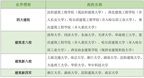 經過長期的發展,我們耳熟能詳的“四大建院”“建筑老八校”等高校都是建筑領域有名的學校。“四大建院”是1960年原建設部(現住房和城鄉建設部)直屬的七所建筑高校中實力最強的四所,被稱作“四大建院”,現均已合并或改名。“建筑老八校”是較早開設建筑學相關專業、在行業內擁有重大影響力的高校。此外,還有被喻為“建筑新八校”“建筑新四軍”等高校也是全國建筑類特色院校。具體詳見下表。