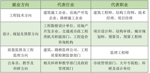 土木工程專業就業方向主要有工程技術方向,設計、規劃及預算方向,質量監督及工程監理方向,公務員、教學及科研方向。所涉行業包括建筑業、房地產開發業、路橋施工、工程勘察設計單位、市政工程類政府機關職能部門、工程造價咨詢機構、科研院所等,詳見下表。