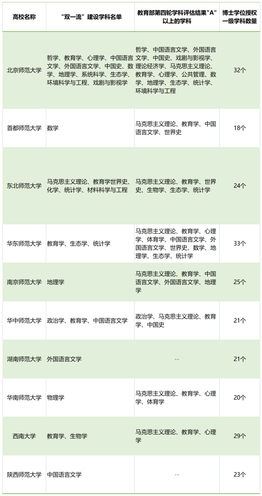 “師范”特色高校由于歷史變遷、學(xué)科傳統(tǒng)、發(fā)展重點(diǎn)、地理優(yōu)勢(shì)等因素,不同的學(xué)科和專業(yè)領(lǐng)域優(yōu)勢(shì)不同,各具特色。高校具備的博士學(xué)位授權(quán)一級(jí)學(xué)科數(shù)量、入選國(guó)家“雙一流”建設(shè)高校及建設(shè)學(xué)科和教育部學(xué)科評(píng)估,這三個(gè)維度可以判斷該高校具備哪些優(yōu)勢(shì)學(xué)科和優(yōu)勢(shì)專業(yè)。下表選取入選國(guó)家“雙一流”建設(shè)高校的師范特色高校,從以上三個(gè)維度,幫助考生深入了解這些高校的優(yōu)勢(shì)學(xué)科和特色專業(yè)。